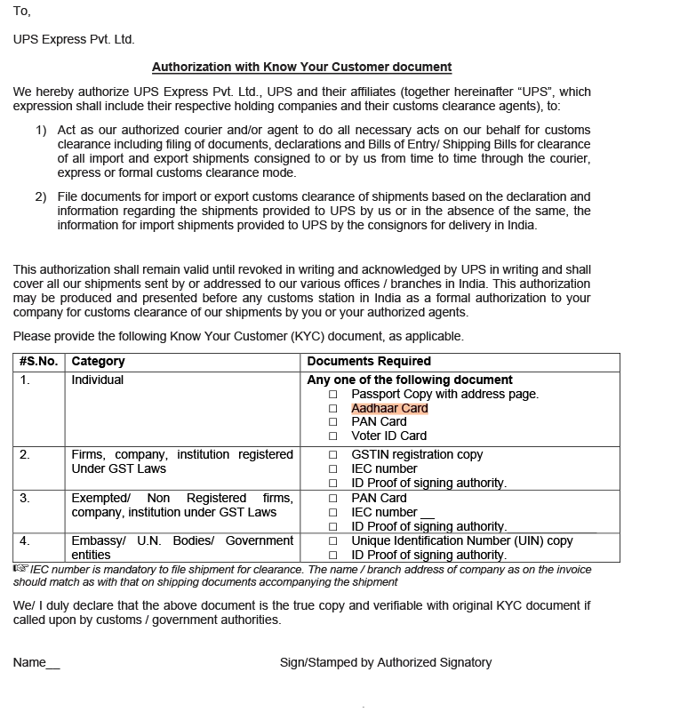 I had to fill a KYC Authorization Letter, giving UPS permission to clear the package on my behalf. Along with that, I uploaded my Aadhaar and PAN details.