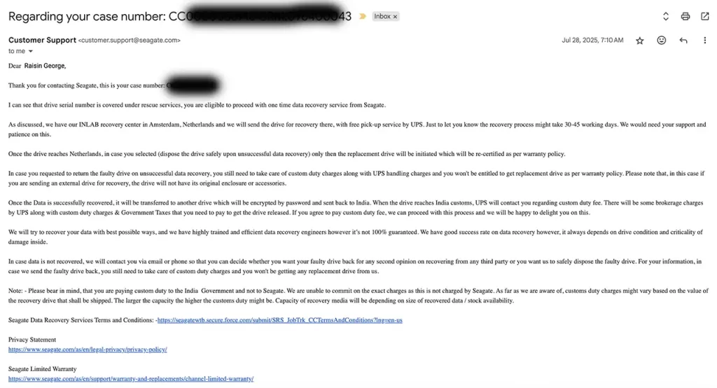 At 6 AM sharp, July 28, 2025, I called Seagate support.